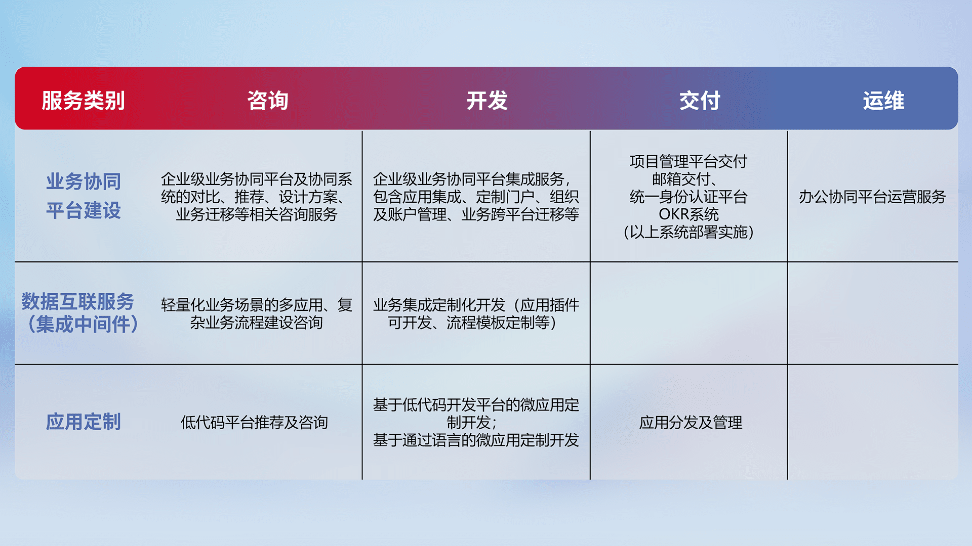 针对钉钉、、、、企微、、、IDaas等平台级产品提供产品的规划、、、、方案、、交付、、定制化开发等服务,,,,实现如统一协同办公、、智能客户服务、、、混合会议管理、、、智能数据查询、、、、等业务场景,,实现数字化转型。。。